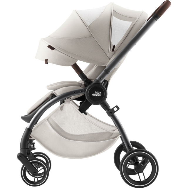 Az ülés előre és hátrafelé is forgatható, így a szülők fenntarthatják a szemkontaktust gyermekükkel, vagy hagyhatják, hogy a kicsi felfedezze a környezetét. Az állítható háttámla és lábtartó, valamint a minden keréken rugózás biztosítják a kényelmes utazást egyenetlen felületeken is. A nagy méretű kupola hatékonyan védi a gyermeket a napsütéstől és a széltől.
