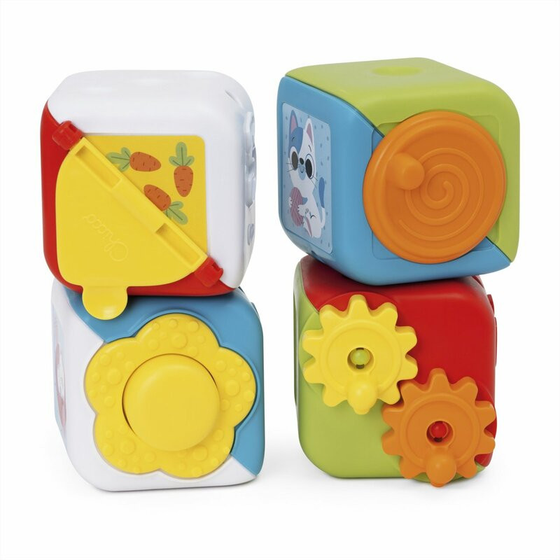 Négy színes kocka, tele olyan tevékenységekkel, amelyek serkentik a kisgyermek manuális és logikai készségeit. Fejlesztő játék, amely végigkíséri a gyermeket a növekedés különböző szakaszain.