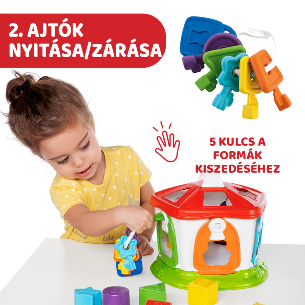 HASZNÁLAT: A ház oldalán állatformákat, a háztetőn át geometriai formákat lehet a megfelelő lyukakba bedobni. A színes ajtókhoz a megfelelő színű kulcs tartozik, ha ezt sikerül összepárosítani, akkor a bedobott forma kivehető.
