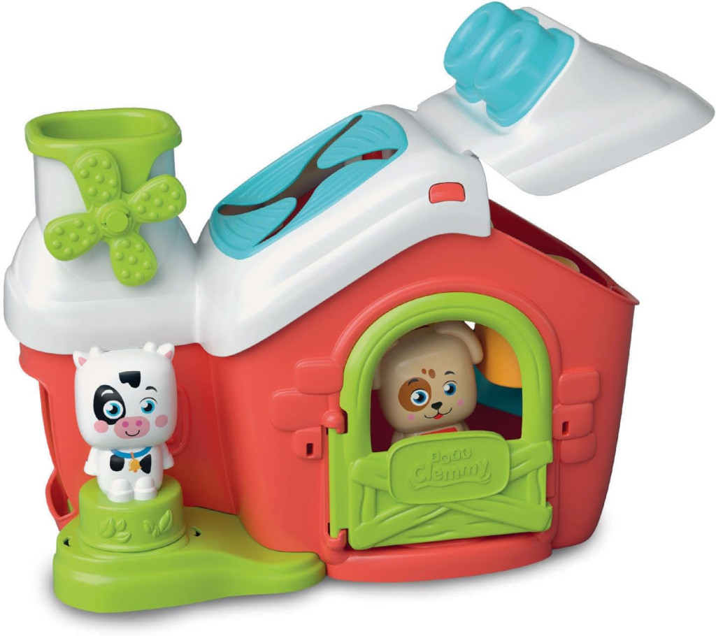 A farmház különböző interaktív elemekkel rendelkezik: forgatható szélkerék, nyitható ajtó és beépített csúszda, amelyen a puha építőkockák legurulhatnak.