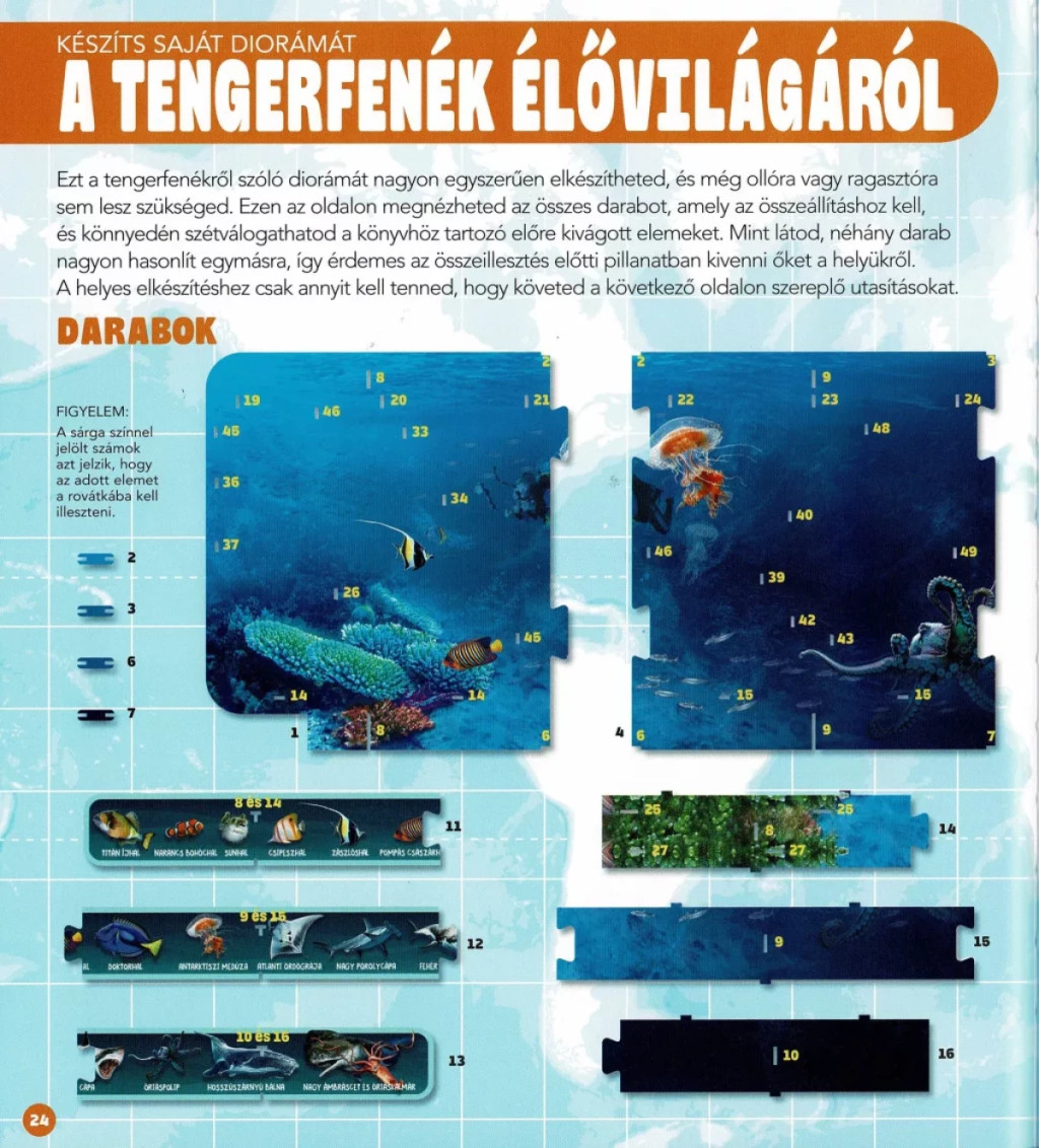 A Dioráma – Tengeri állatvilág a kézzel fogható felfedezés erejével hozza közel az óceánok titkait. A kötet két élményt egyesít: rövid, közérthető ismereteket ad a tengerek állatvilágáról, miközben a könyvben található előre kivágott, ragasztás nélkül összeállítható elemekből egy látványos, 3D-s tengerfenék-díszlet építhető. A kész dioráma polcra, íróasztalra vagy szobadísznek is tökéletes – egy mini „akvárium”, amelyet a gyerekek saját kezűleg készítenek el.
