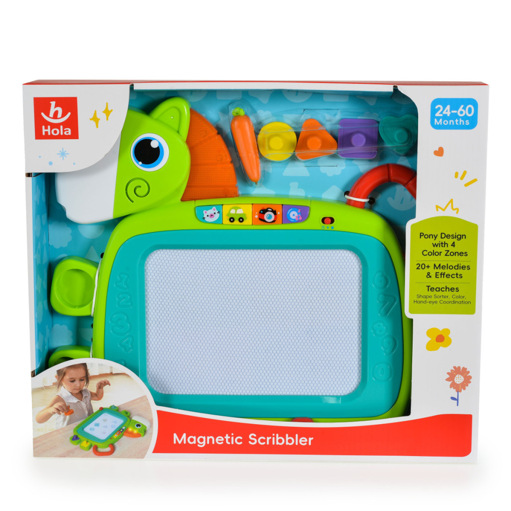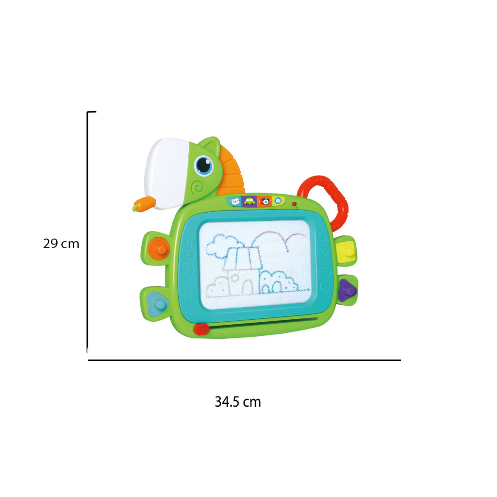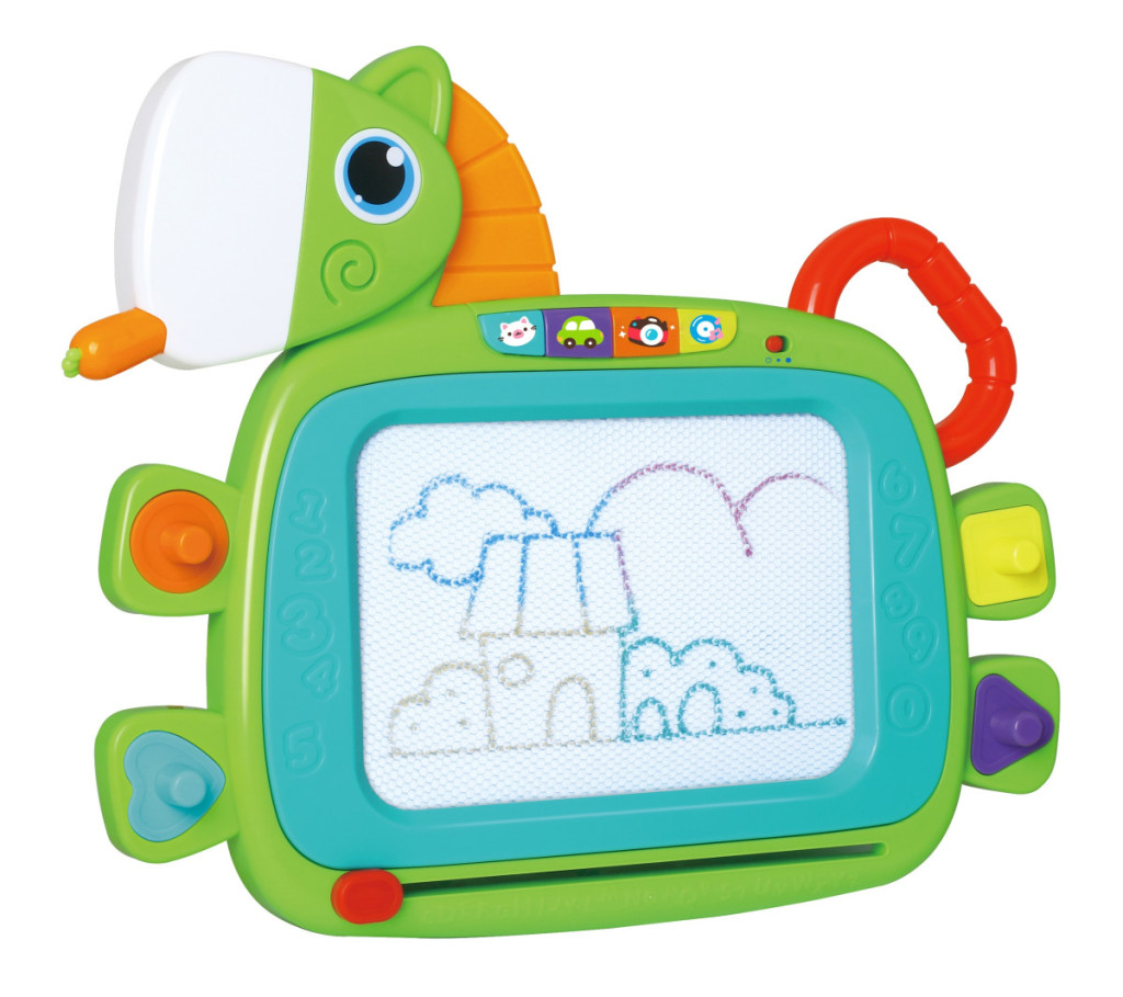 Pónis kialakítás; ergonomikus fogantyú; hanghatás; zenegomb; a radírt oldalra csúsztatva tisztára törölheti a táblát és szórakoztató hanghatásokat játszhat