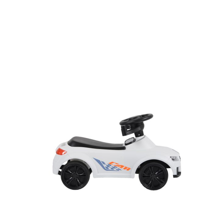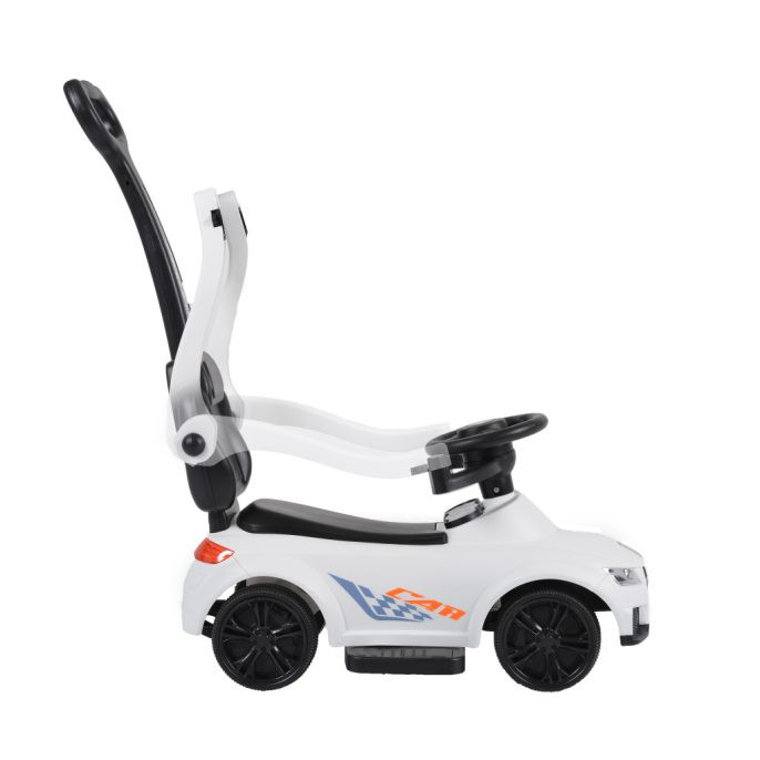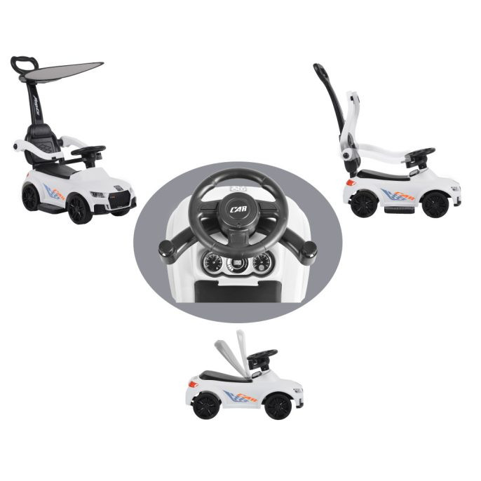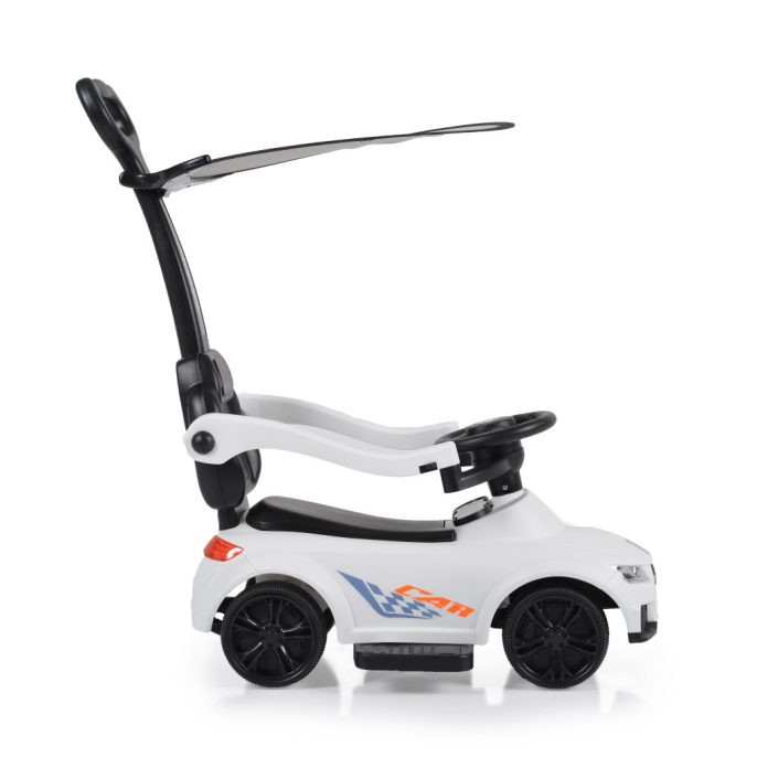 Levehető szülői irányító fogantyúval és tetővel, levehető első biztonsági léccel és lábtartóval a kisebb gyermekek számára. A kormányon különböző szórakoztató dallamok gombjai találhatók.