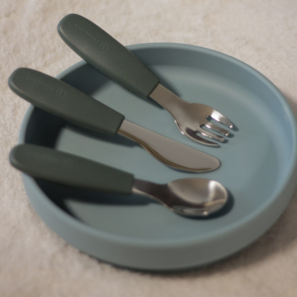 A funkcionális részek kiváló minőségű rozsdamentes acélból készülnek, a fogantyúk ergonomikusak és puha, élelmiszerekkel való érintkezésre alkalmas szilikonnal vannak bevonva - ideális a gyermekkéz számára. Ez kényelmes és biztonságos fogást biztosít, és elősegíti a helyes étkezési szokásokat.