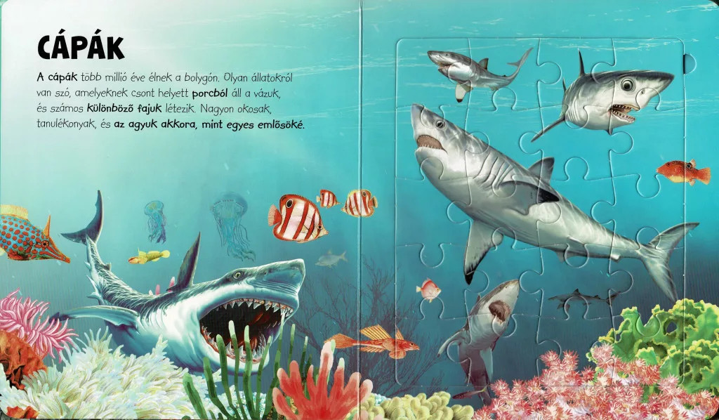 A Szuper puzzle – Tengeri állatok a víz alatti világ nyugodt, elmélyülős felfedezésére hív. A 6 db, egyenként 20 darabos puzzle változatos, mégis jól átlátható jelenetekkel dolgozik, így a gyerekek könnyen találnak kiindulópontot: egy jellegzetes forma, egy színátmenet vagy egy mozdulat segít elindulni, majd a részletek finom illesztése építi fel a teljes képet. A kirakás folyamata természetes ritmust ad – koncentráció, megfigyelés, illesztés, visszalépés, újrapróbálás –, amelyben a gyerekek megtapasztalják a fókuszált figyelem örömét.