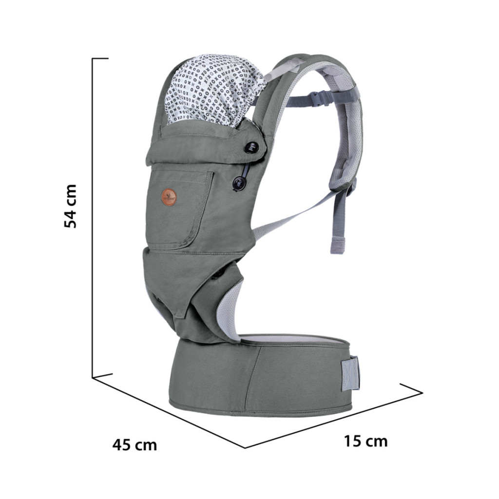 Kapucnival rendelkezik a baba fejének védelmére, praktikus zsebbel a kiegészítők számára, és ergonomikus M-alakot biztosít a baba lábának.