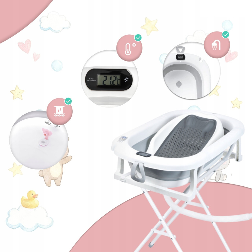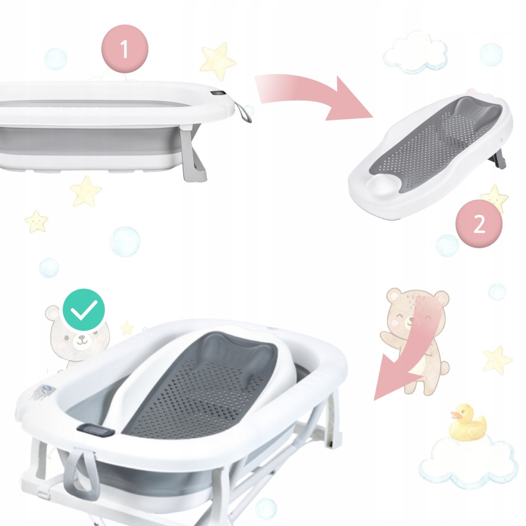 Premium Összecsukható kád hőmérővel és anatómiai támasztékkal + állvány - Szürke
