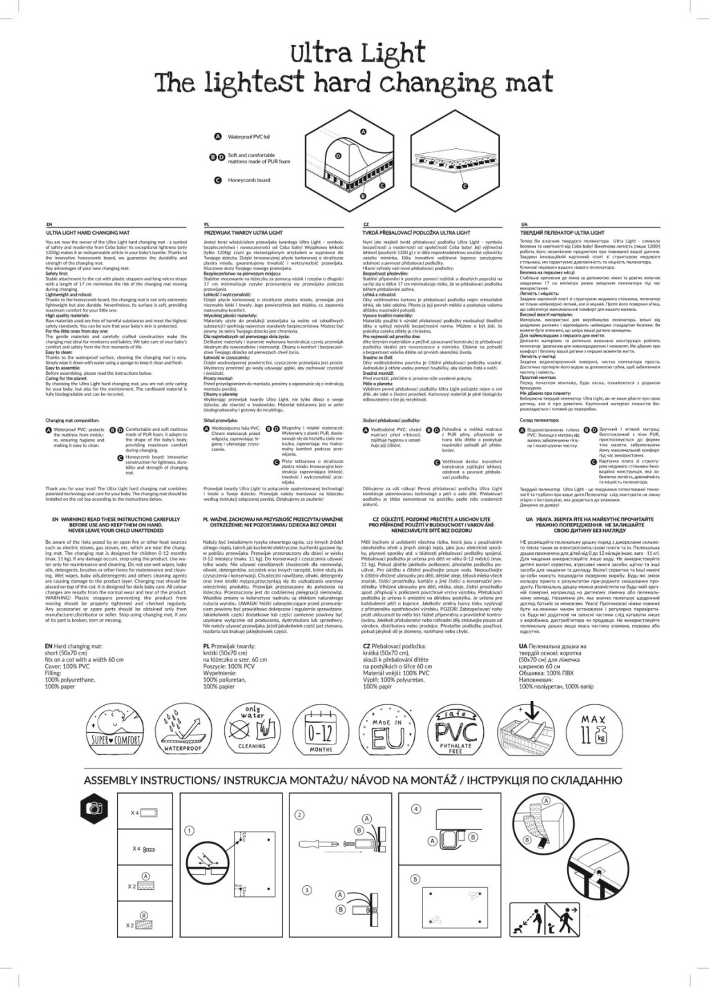 A merev pelenkázólap aljában egy deszka van, és négy láb szerelhető rá, hogy megakadályozza annak elmozdulását a kiságyon. A puha töltelék miatt a pelenkázás kényelmes és pihentető. A párnázott pelenkázólap a legmagasabb minőségű tanúsított fóliából készül - biztonságos a baba finom bőrének és könnyen tisztítható.
