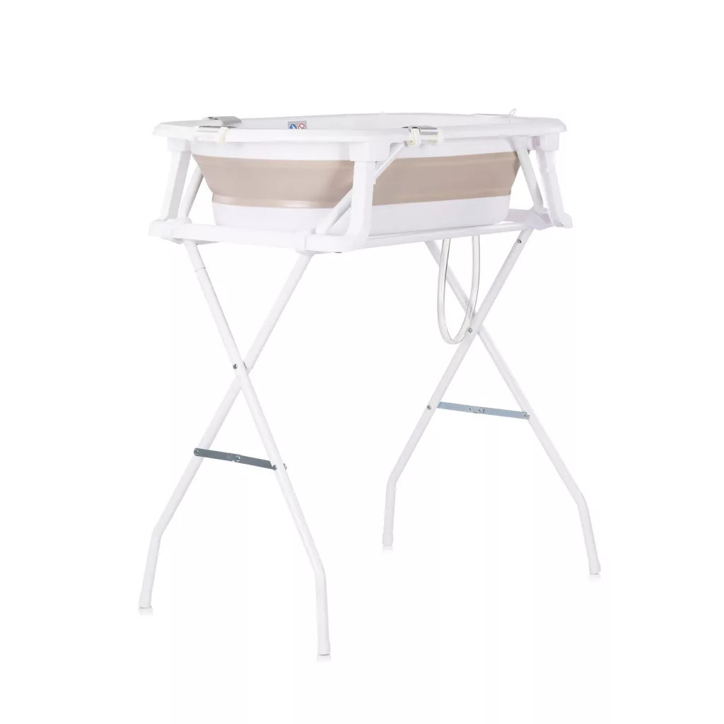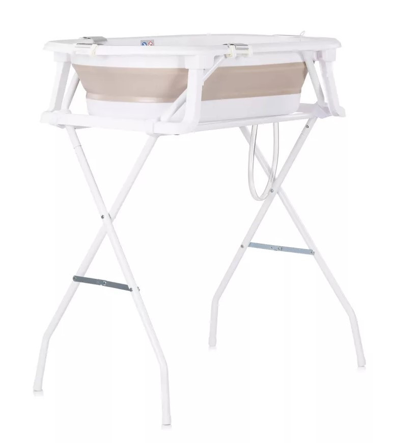 - Összecsukható fém állvány – kényelmes magasságba emeli a kádat, védve a szülők hátát.